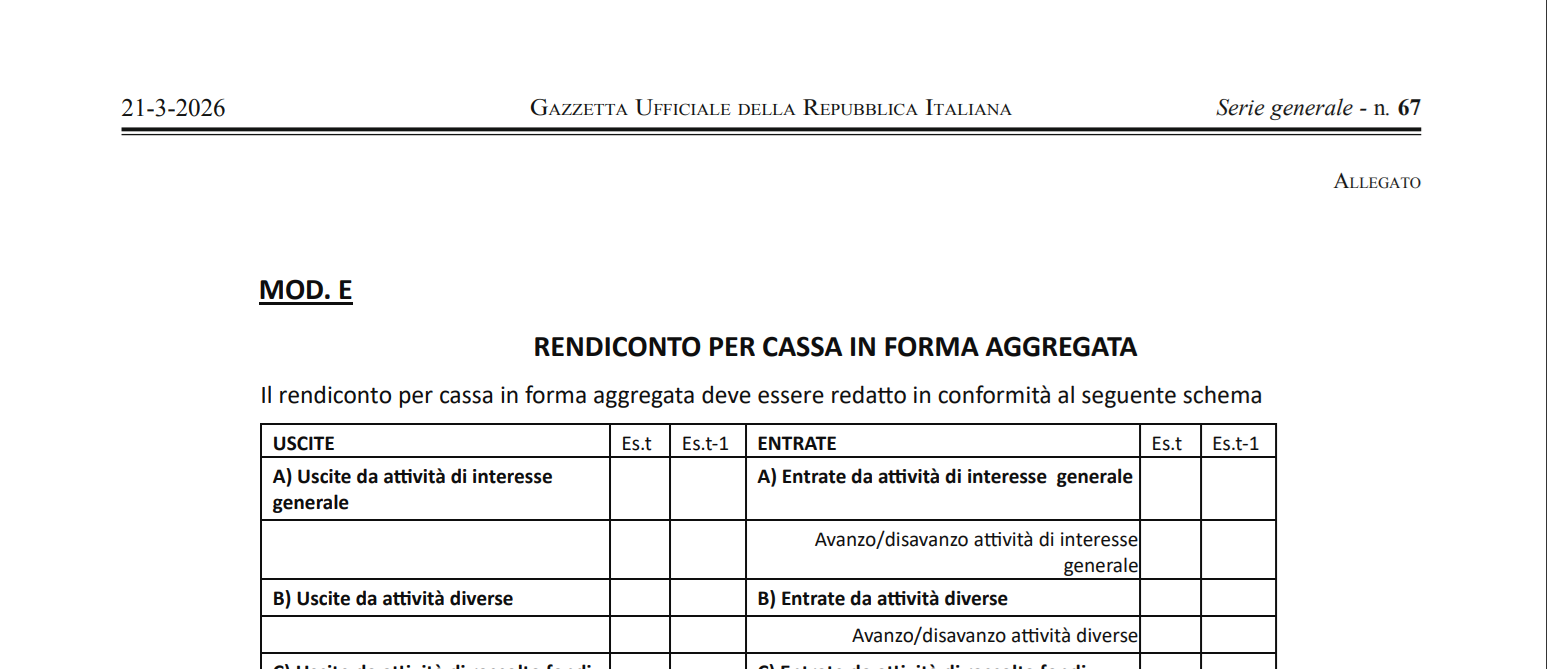 I dettagli normativi sono stati chiariti con la pubblicazione nella Gazzetta Ufficiale n. 67 del 21 marzo 2026 del D.M. 18 febbraio 2026. Attraverso questo provvedimento, il Ministero del Lavoro e delle Politiche Sociali ha reso disponibile il cosiddetto “Modello E” in forma aggregata. Questo nuovo modello definisce la struttura ufficiale da utilizzare per il rendiconto per cassa 2026, permettendo alle associazioni interessate di adottare sin da subito queste regole contabili più agili.